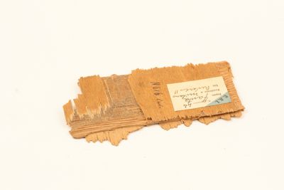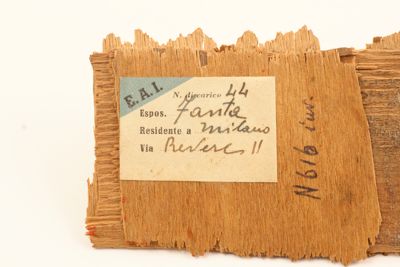 frammento di fusoliera di aereo con incollata un'etichetta in carta con l'iscrizione: Etichetta E.A.I. n° di carico 44 / Espositore Fanta / residente a Milano / indirizzo Revere 11. Scritta a mano N 616 inv.