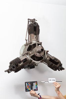 Motore a 3 cilindri disposti a Y, raffreddato ad aria. La superficie esterna dei cilindri presenta un'alettatura per il raffreddamento. I cilindri e il carter sono stati parzialmente sezionati a scopo didattico.