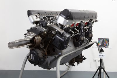 Motore a 12 cilindri in linea disposti a V di 60° d'ampiezza, raffreddato ad acqua. I cilindri sono in acciaio con una testata monoblocco in alluminio per ogni fila di cilindri; la testata prevede il passaggio della camicia dell'acqua in corrispondenza della sede delle valvole. La distribuzione è basata su quattro valvole per cilindro, comandate da un albero a camme in testa. Il motore dispone di quattro carburatori aspirati, due per lato, con compressore centrifugo ad uno stadio e una velocità. Due magneti, posti nella parte posteriore del motore, alimentano due candele d'accensione per ogni cilindro; i cavi elettrici sono sistemati nella parte interna della V dei cilindri. Un riduttore a ingranaggi conici ad assi fissi è posto tra l'albero a gomiti e l'albero dell'elica. Il motore è parzialmente sezionato.