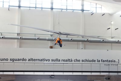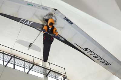 Anche la sua attrezzatura viene controllata con le più sofisticate tecnologie. Nella Galleria del vento Fiat di Orbassano è stat studiata la posizione ottimale da tenere rispetto all'ala e al casco, sottoponedo pilota e attrezzature a temperature di 42° sotto zero e velocità del vento superiore ai 100 km/h.
