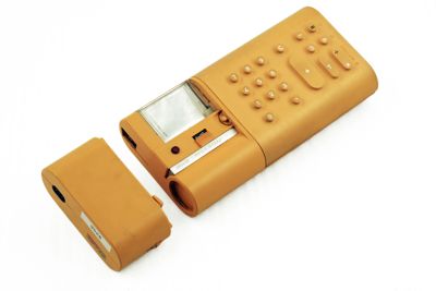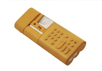 Calcolatrice elettronica con stampante, costituita da un corpo in plastica gialla dai lati anteriore e posteriore bombati. L'apparecchio presenta una tastiera ridotta ricoperta da una membrana di gomma; a destra della tastiera sono situati i pulsanti delle quattro operazioni aritmetiche, del totale e del totale parziale. A sinistra della tastiera si trova l'apparato di stampa delle operazioni svolte, funzionante con uno speciale rotolo di carta metallizzata. Al di sotto della stampante si trovano l'interruttore per l'accensione della calcolatrice, la rotella per la selezione del numero di cifre decimali da adoperare e una spia luminosa per la segnalazione della disattivazione. Sul lato inferiore dell'apparecchio si trova lo sportello asportabile per l'inserimento del rotolo di carta metallizzata. La calcolatrice è dotata di un caricabatterie in plastica gialla della stessa forma da applicare sul fianco sinistro dell'apparecchio; sul fianco sinistro del caricabatterie si trova la presa bipolare per il collegamento del cavo di alimentazione. La calcolatrice è accessoriata con una batteria ricaricabile di riserva, il cavo per l'allacciamento alla rete elettrica, una confezione di rotoli di carta metallizzata e una custodia in finta pelle per il trasporto.