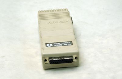 Dispositivo in materiale plastico beige, con, ai due lati opposti, un connettore per il collegamento ad un home computer Commodore mediante porta monitor RGB e un connettore standard UHF RF.