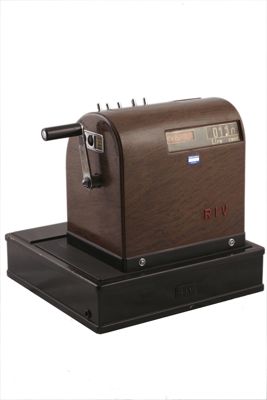 Registratore di cassa poggiante su un basamento in legno, verniciato di nero. Sul lato anteriore, il basamento presenta il cassetto per la sistemazione della valuta e un piano superiore sul quale è applicata una lastra di vetro nero. Il corpo del registratore è in metallo, verniciato ad imitiazione delle venature del legno. L'impostazione delle cifre da registrare avviene mediante cinque leve, correnti in altrettante feritoie sul lato anteriore. Alla sinistra delle leve si trovano i comandi di stampa della ricevuta. Il registratore è dotato di due visualizzatori del totale; nel lato anteriore, l'indicatore è posto al di sotto della tastiera, mentre l'indicatore per il cliente si trova nella parte superiore del lato posteriore. Alla sommità del registratore, uno sportello apribile racchiude l'indicatore del totale di cassa. Sul fianco destro del registratore di cassa si trova la manovella, con impugnatura in ebanite, per l'esecuzione della registrazione. Ad ogni rivoluzione della manovella, il cassetto si apre automaticamente ed un campanello avverte dell'apertura.