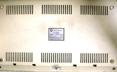 C= commodore/ C64C/ Funkensört n. DBP-Vfg. 1046/84/ 5 V = ; 9 V ~ 15 W/ SER.NO. DA 4 025403B1/ MADE IN WEST GERMANY (commerciale/ documentaria)