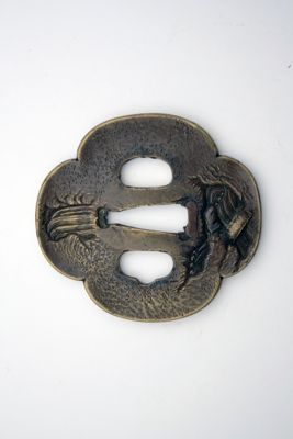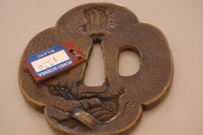Elsa di spada giapponese di forma quadrilobata (mokkogata), con i tre fori canonici, quello centrale (nakagoana) per il codolo, il foro di sinistra (kozuka hitsuana) per il coltellino, e quello di destra (kogai hitsuana) per lo spillone. E' rappresentato un paesaggio di montagna, dove due samurai stanno attraversando un ponte di legno per andare verso una casa. Il paesaggio è dominato dalla presenza di alte montagne rocciose. L'oggetto è stato realizzato in Sentoku, una lega simile all'ottone.