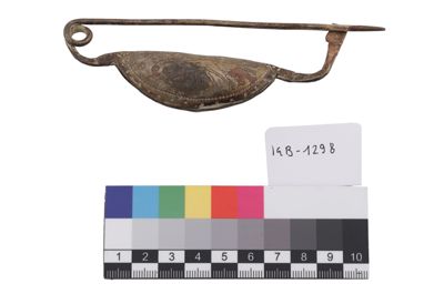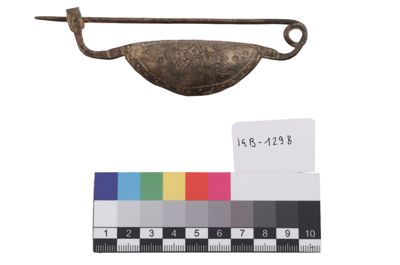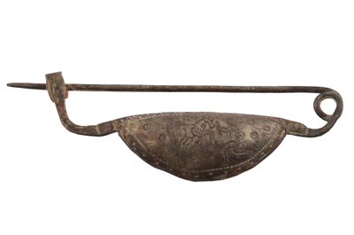 ite. Fibula in stile etrusco in argento, con decorazioni incise rappresentanti una figura maschile ed un cavallo.