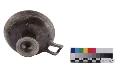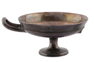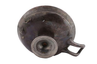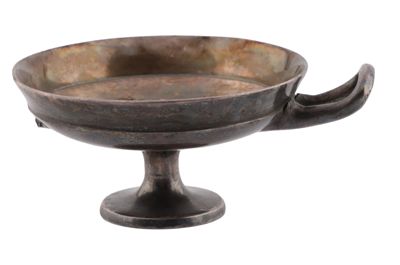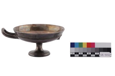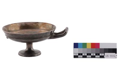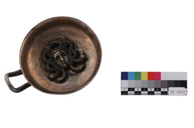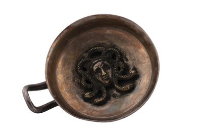 Coppa kylix in metallo con in rilievo Medusa. Manca un manico.