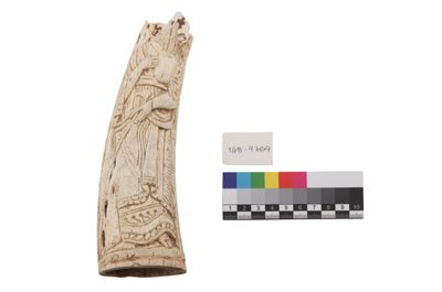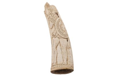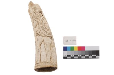 Oggetto in osso con decorazioni in rilievo, rappresentanti una figura femminile col seno scoperto e un soldato.