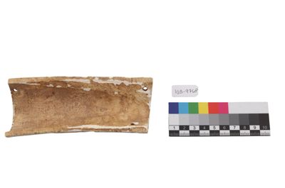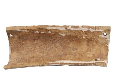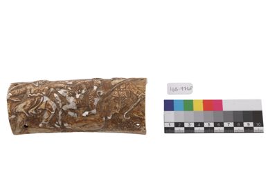 Placca concava in osso con decorazioni a rilievo, che rappresentano due contadini, che cercano di allontanare due animali che si stanno ferendo. È visibile una iscrizione: "KΛYTIA". Sono presenti quattro fori ai lati