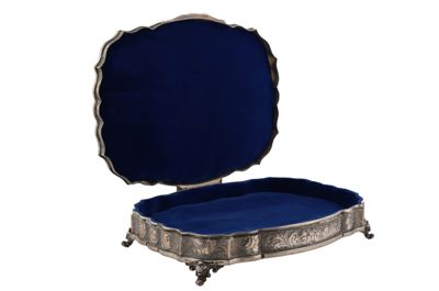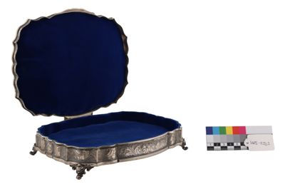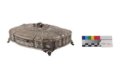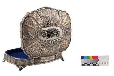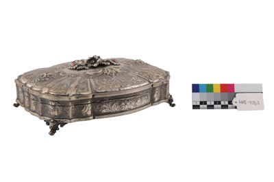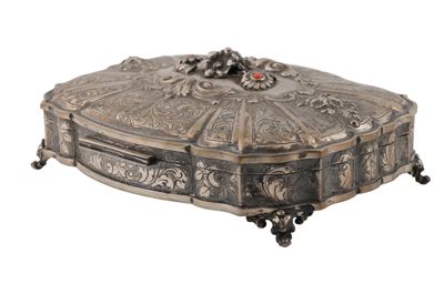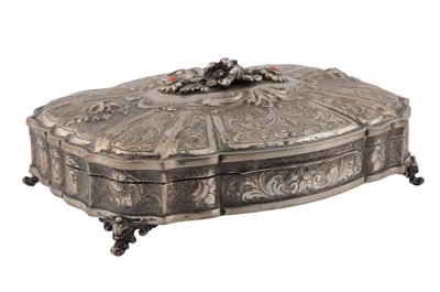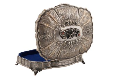 C.R. - Cofanetto in argento lavorato a sbalzo e inserti di corallo. Databile al 1947/48.
