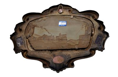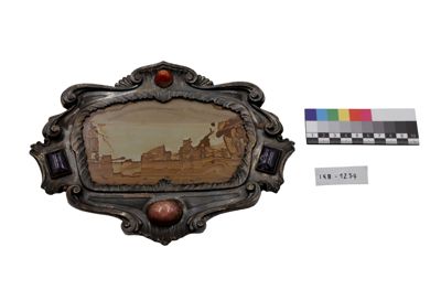 Lastra in pietra paesina in cornice d'argento lavorata a sbalzo e pietre dure incastonate