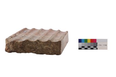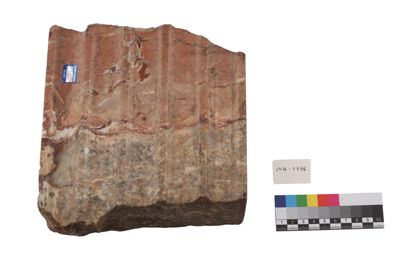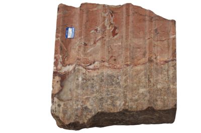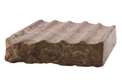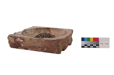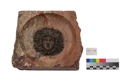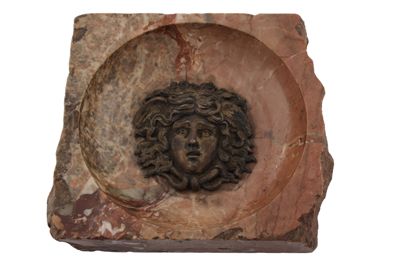 Il manufatto, probabilmente un posacenere, si presenta come un rilievo in marmo e con decorazione centrale in argento ad imitazione stile etrusco-romano e iconografia antica: qui è una testa di gorgone argentea su base marmorea rosa.