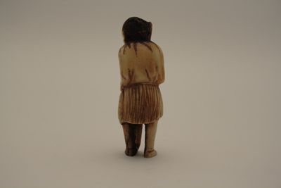 Statuetta, okimono, in osso raffigurante un uomo con in mano un remo e il suo cappello di paglia. L'uomo indossa una gonna di paglia, copertura tipica dei pescatori. Alcuni dettagli, come i capelli e le decorazioni della veste sono incisi in nero.