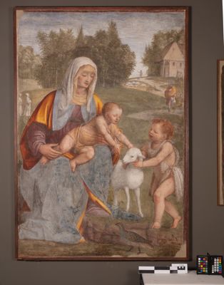 Affresco strappato raffigurante la Madonna col Bambino, San Giovannino, l'agnellino e un certosino, proveniente dall'Ospizio di San Michele alla Chiusa a Milano. In deposito dalla Pinacoteca di Brera.