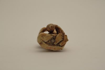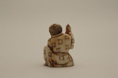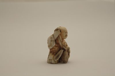 Piccola scultura, okimono, in avorio patinato raffigurante un uomo con una piccola palma. Sono visibili dei segni incisi in nero sotto la base, ed un foro con il quale l'okimono veniva fissato a una base.