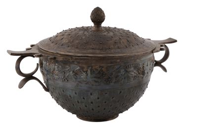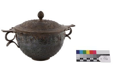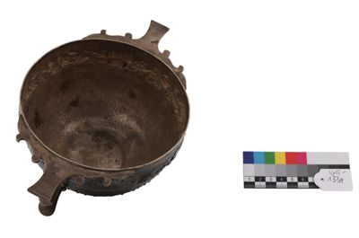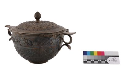 È visibile una incisione a lettere greche "ΠΛANHTA", da indentificare con l'autore dell'oggetto, le Argenterie Planeta di Napoli, attive nella prima metà del Novecento. Francesco Mauro e la moglie aquistarano molti argenti in stile antichizzante da questo argentiere, citato più volte nell'elenco topografico della loro collezione, contestuale alla donazione al Museo.
