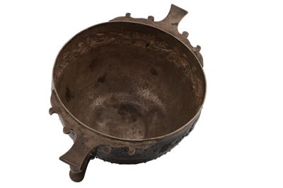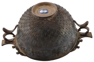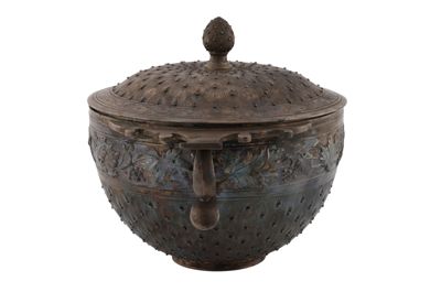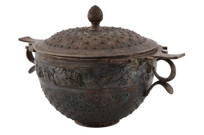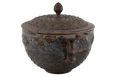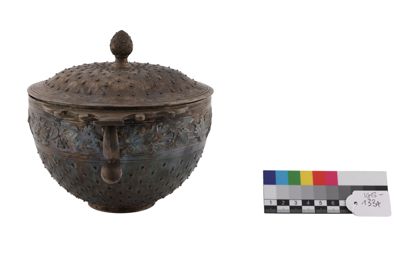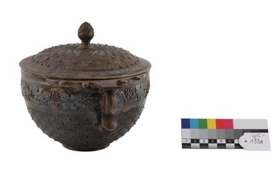 Il manufatto si presenta come una coppa in argento dotata di coperchio di piccole dimensionio: qui il coperchio, sempre in argento, è decorato da piume di pavone incise e motivi a sfera in rilievo, mentre il vaso presenta la medesima decorazione del coperchio, ma con l'aggiunta di un registro nella parte alta che corre circolare su tutto il corpo e che è decorato da foglie e frutti di vite.