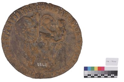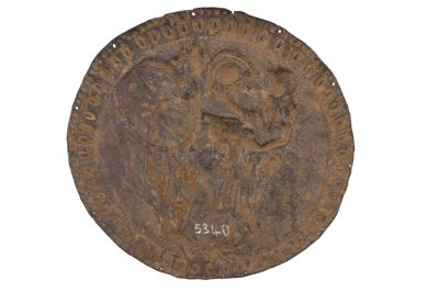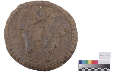 Oggetto probabilmente non in argento, che rappresenta in rilievo un guerriero giovane che restituisce la sua armatura ad un altro guerriero. Sono visibili fori ai bordi.