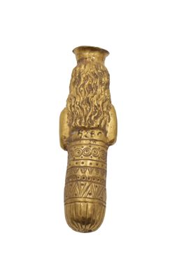 Il manufatto si presenta come un lacrimatoio di piccole dimensioni in oro ad imitazione stile etrusco-romano e iconografie antiche: qui è una forma cilindrica a forma di busto e testa di donna nella parte superiore, mentre la parte inferiore è caratterizzata da motivi geometrici incisi.