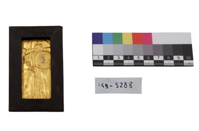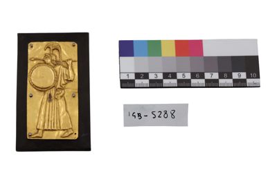 Il manufatto si presenta come una placca in oro di piccole dimensioni ad imitazione stile etrusco-romano e iconografie antiche: qui è raffigurata probabilmente la dea Minerva con elmo, lancia e scudo.