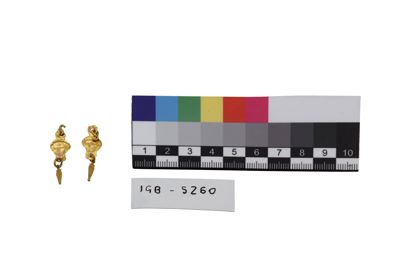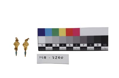 Il manufatto si presenta come un paio di orecchini in oro ad imitazione stile etrusco-romano e iconografie antiche: qui sono raffigurate due teste femminili, sotto le quali è un pendente a forma di goccia decorato in smalto azzurro e terminante in una piccola sfera.