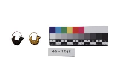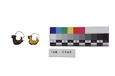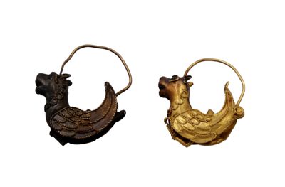 Il manufatto si presenta come un paio di orecchini in oro di piccole dimensioni ad imitazione stile etrusco-romano e iconografie antiche: gli orecchini hanno la forma di un ibrido animale, probabilmente un incrocio tra un cane e un volatile piumato.