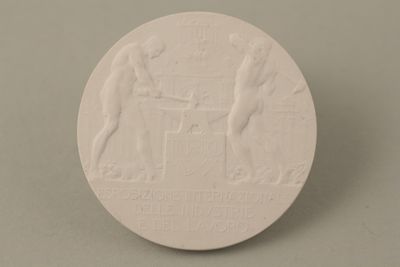 Il calco in gesso venne realizzato nel 1955 dallo Stabilimento Stefano Johnson di Milano come integrazione della corrispettiva medaglia, mancante nel medagliere donato nell'anno precedente al Museo Nazionale della Scienza e della Tecnica Leonardo da Vinci, in quanto lo Stabilimento desiderava conservarne l'unico esemplare in possesso. L'opera da cui il calco è ricavato è una medaglia coniata dall'Istituto Stefano Johnson di Milano per commemorare l'Esposizione universale di Torino, tenutasi dal 29 aprile al 19 novembre 1911, in concomitanza con il 50° anniversario dell'unità d'Italia. Storicamente la medaglia è particolarmente significativa in quanto richiama nell'iscrizione al verso gli eventi bellici della guerra italo-turca di Libia, combattuta tra il 29 settembre 1911 ed 18 ottobre 1912, e quindi, al momento dell'emissione della medaglia non ancora conclusa. L'Esposizione di Torino fu inoltre una delle ultime Esposizioni universali prima della lunga interruzione dovuta al Primo conflitto mondiale e successiva crisi socio-economica e politica di tutta Europa. Il fenomeno delle Esposizioni universali, inaugurato con l'Esposizione di Londra del 1851, aveva scandito il corso del XIX secolo in un trionfo di ostensione della potenza industriale e coloniale dei principali paesi europei.