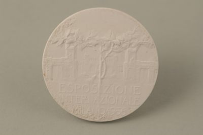 Il calco in gesso venne realizzato nel 1955 dallo Stabilimento Stefano Johnson di Milano come integrazione della corrispettiva medaglia, mancante nel medagliere donato nell'anno precedente al Museo Nazionale della Scienza e della Tecnica Leonardo da Vinci, in quanto lo Stabilimento desiderava conservarne l'unico esemplare in possesso. L'opera da cui il calco è ricavato è la medaglia premio dell'Esposizione Internazionale di Milano del 1906, realizzata da Giannino Castiglioni a seguito della vittoria al concorso bandito dall'Esposizione per la medaglia ufficiale. Nello stesso anno lo scultore fu introdotto nello Stabilimento Johnson dal padre Giacomo, che vi lavorava come capofabbrica: questa medaglia consiste in una delle sue prime opere di modellatore (cfr. Gugliemi 2015, p. 43, Johnson 1966, p.108). Il lascito Johson comprende altre medaglie di Giannino Castiglioni (cfr. nn. inv. 14027, 14136, 14264, 14303, 14314, 14316, 14336, 14391, 14673, 14679, 14695, 14696, 14701).