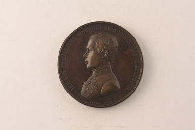 Medaglia realizzata nell'occasione della posa della prima pietra del collegamento ferroviario Trieste-Vienna, Ferrovia Meridionale, Südbahn, ad opera dell'imperatore Francesco Giuseppe (1848-1916) e in presenza delle massime autorità religiose e politiche cittadine, avvenuta il 14 maggio 1850.
