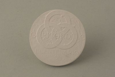 L'opera da cui il calco è ricavato è una medaglia prodotta dall'Istituto Stefano Johnson di Milano per commemorare il I° centenario della fondazione della Casa musicale Ricordi a Milano ad opera dell'editore musicale Giovanni Ricordi (1785-1853).
