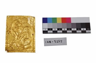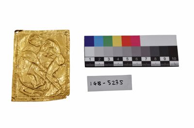 Il manufatto si presenta come una placca in oro di piccole dimensioni ad imitazione stile etrusco-romano e iconografie antiche: qui è raffigurato Ercole in lotta contro il Leone Nemeo.