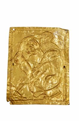 Placca in oro in stile etrusco-romano con Ercole e leone