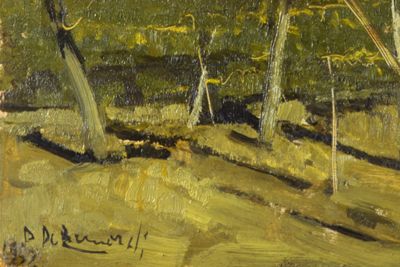 Dipinto a olio di medie dimensioni di Domenico de Bernardi, raffigurante un paesaggio con alcuni alberi in primo piano, una casa gialla a due piani con i panni stesi alle finestre, sulla destra e montagne sullo sfondo.
