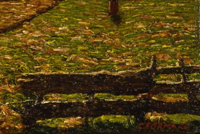 Dipinto a olio di piccole dimensioni di Carlo Fornara, raffigurante un paesaggio agricolo con il sole che sta per tramontare, un contadino sulla sinistra visto di spalle e un paese sullo sfondo.