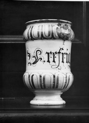 Questo tipo di vasi incontrarono particolare favore presso i committenti nel corso di tutto il XVIII secolo. Alcune caratteristiche nel decoro come il colore fortemente diluito, una certa fretta nell'esecuzione anche in un esemplare con stemma farebbero ipotizzare una produzione di fabbriche minori dell'Italia settentrionale della metà del XVIII secolo. Tuttavia la forma avvicina il nostro esemplare ad alcuni reperti di scavo di area veneta (N. Stringa 1987) ciò porterebbe ad attribuire l'oggetto ad ambito veneto.