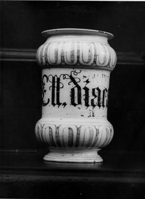 Alcune caratteristiche nel decoro come il colore steso con una certa precisione, ma molto diluito le scritte realizzate in caratteri gotici molto calligrafiche ed una struttura morfologica diversa rispetto ad altri esemplari come, ad esempio, il collo piuttosto corto farebbero ipotizzare una produzione di fabbriche minori in ambito veneto della prima metà del XVIII secolo.