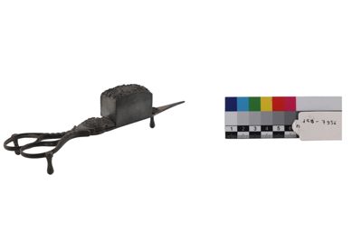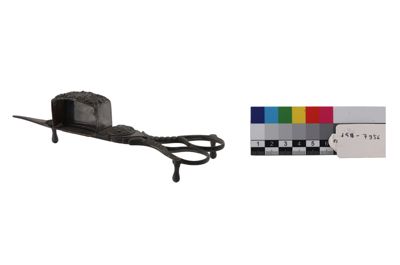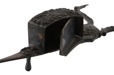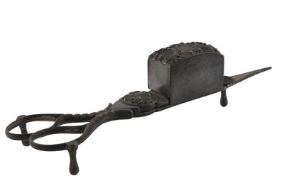 Forbice inglese per lucerna in metallo con decorazioni floreali in rilievo.