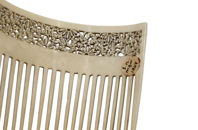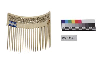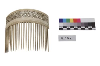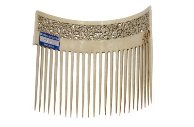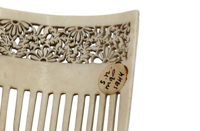 Il manufatto si presenta come una pettiness in avorio perfettamente conservata: รจ caratterizzato da una lavorazione a giorno con decorazione vegetale e floreale sul bordo superiore e conta di 26 denti, di cui l'ultimo a destra mancante.