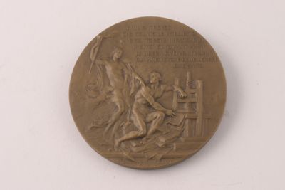 Al recto, ritratto di tre quarti di Emilio Treves volto a destra. Al verso, composizione allegorica con, sulla sinistra, figura femminile che regge una torcia accesa e poggia la mano sulla spalla di una figura maschile, sulla destra, in atto di azionare un torchio a vite da cui fuoriescono diversi fogli stampati.
