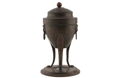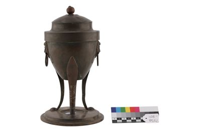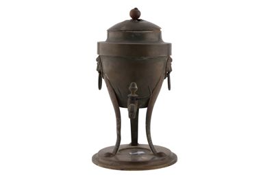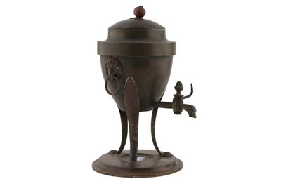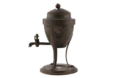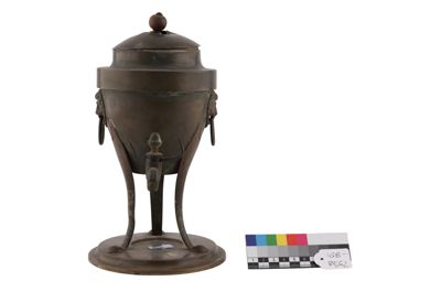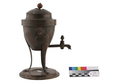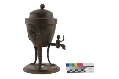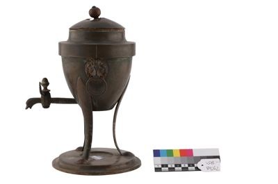 Il manufatto si presenta come un samovar in metallo: il corpo centrale poggia su un'ampia base circolare ed è sorretto da tre supporti verticali ricurvi che si collegano alla parte inferiore della pancia mediante grandi foglie metalliche. Il corpo è poi decorato anche da due protomi leonine.