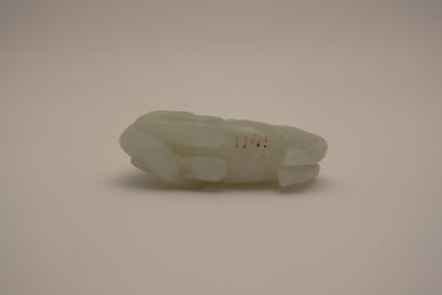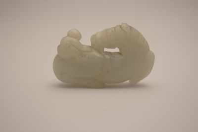 Scultura in giada "celadon" raffigurante un cavallo accovacciato a terra, con la testa rivolta all'indietro, con una scimmia sopra il dorso che tira le redini con le zampe.