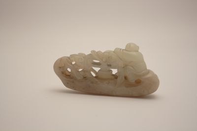 Piccola scultura in nefrite di colore verde chiaro con venature arancioni raffigurante un bambino che rema su una giunca sulla quale è posato un vaso dal quale esce una pianta dell'immortalità (lingzhi). Il fondo della giunca è tutto inciso a disegno di flutti. L'artista è riuscito ad approfittare delle diverse sfumature della giada, evidenziando l'imbarcazione.