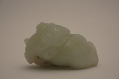 Scultura in giada celadon raffigurante un bambino sdraiato che tiene fra le braccia un'anatra che tiene nel becco un fiore di loto.
