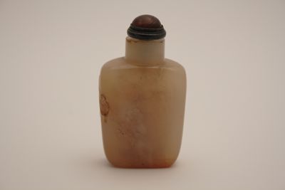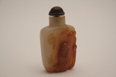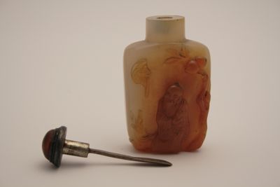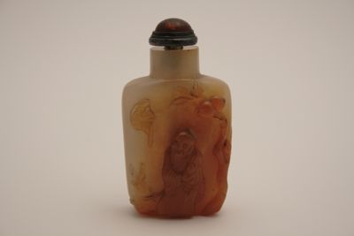 Boccetta da fiuto in calcedonio con base piatta, pianta ovale e alte pareti terminanti a spalla squadrata e breve collo circolare. Tappo circolare in legno e corallo con cucchiaino interno in avorio per sollevare il tabacco. La pietra si presenta gialla di aspetto diafano. Una parete è decorata a bassorilievo, in rosso, con la figura di Shoulao con in mano la pesca della longevità, accompagnato dal suo cervo, nei pressi di un albero di pesco, vicino al quale si trova anche un pipistrello.