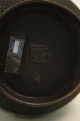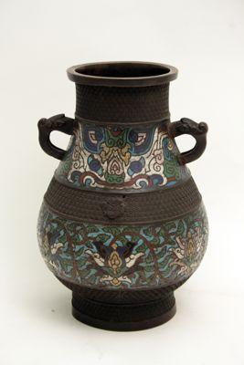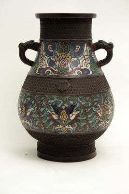 Vaso di forma arcaicistica, di tipo "hu", con piede cilindrico, basso, a pianta ovale, pancia espansa schiacciata verso il basso, spalla spiovente e collo tozzo, terminante a bocca ovale e con labbro everso. Manici semicircolari a protromi zoomorfe stilizzate. La decorazione è suddivisa per fasce alternate: tre in bronzo a bassorilievo e due centrali a smalti cloisonné. La prima fascia, che copre il collo, è decorata a motivi geometrici ripetuti costituiti da esagoni concentrici "a carapace di tartaruga". La seconda, appena più in basso, è a smalti, e presenta fiori di loto e altri elementi fitomorfi. La terza fascia, mostra al centro due mascheroni Taotie. La quarta fascia, a smalti, presenta grandi motivi di mascheroni Taotie, e infine l'ultima fascia, che interessa il piede e parte della pancia, presenta nuovamente gli stessi motivi geometrici del collo.
