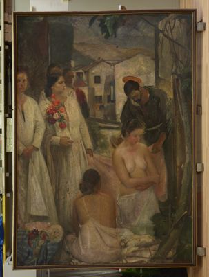 Dipinto a olio di grandi dimensioni di Pietro Gaudenzi, raffigurante San Giovanni che battezza una giovane donna sulla destra; in primo piano un'altra donna, seduta di schiena; sulla sinistra un corteo di quattro donne vestite di bianco; sullo sfondo una veduta di paese.