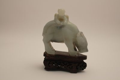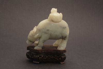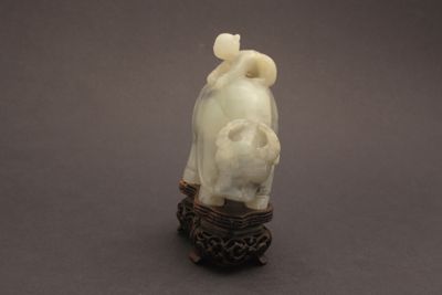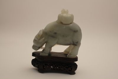 Scultura in nefrite di colore verde azzurro, con venature nere, raffigurante un bambino a dorso di bufalo. Il bufalo è incurvato, con la testa abbassata, e il bambino si regge sul dorso stando accovacciato e tenendo fra le mani la corda attaccata al naso dell'animale. La scultura poggia su una base in legno sagomata, con bordo intagliato a greche e base traforata a tralci fitomorfi con quattro piedini.