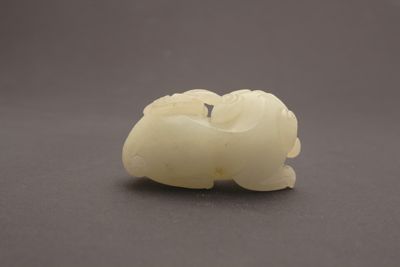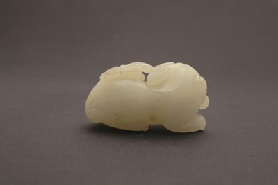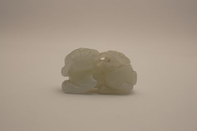 Piccola scultura in giada celadon intagliata a forma di leoncino con un fungo (lingzhi) fra le fauci.