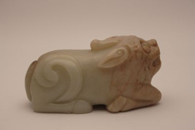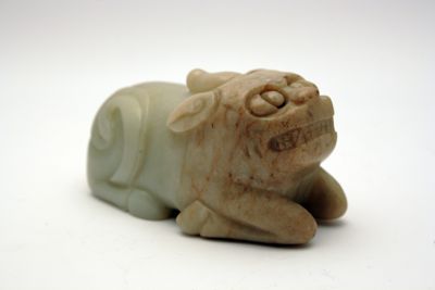 Scultura in nefrite con venature giallastre e verdi raffigurante l'animale mitologico qilin in posizione seduta, le zampe sotto al ventre e lo sguardo alzato, con le fauci in vista. Il qilin è una combinazione di animali reali e fantastici. Nella versione più comune si presenta con corpo di cervo, con scaglie di pesce, zampe ungulate e testa di drago bicorne o, altrimenti, con testa leonina bicorne o a unicorno. In questo caso l'animale presenta una testa leonina con unicorno, è privo di scaglie evidenti e presenta linee squadrate ed essenziali. L'oggetto posa su una base sagomata e intagliata in legno.