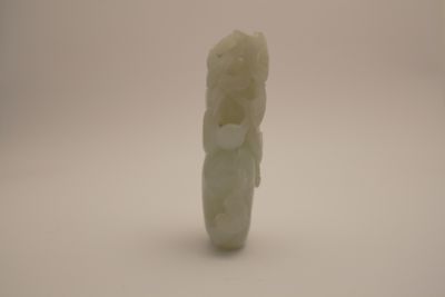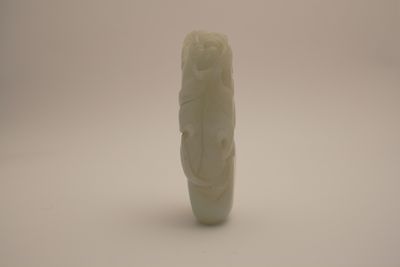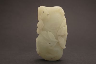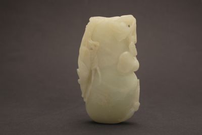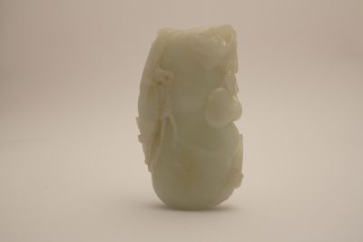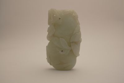 Vasetto in giada di colore verde chiaro con venature bianche, a forma di pesche avvoltie da foglie, con in basso un piccolo pipistrello appeso.